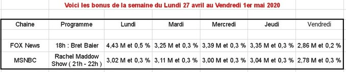 A noter que sur certains jours, MSNBC est devant FOX News sur le taux, mais l’horaire est différent.