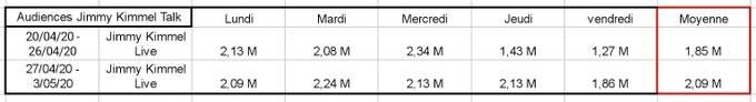 Heureusement, la semaine dernière, Jimmy Kimmel a retrouvé son allure de croisière, à plus de 2 M de fidèles en moyenne pour ABC.