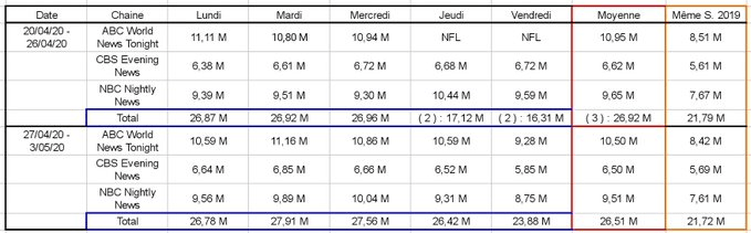 NBC est 2e autour des 9,5 M de moyenne, avec parfois des scores à plus de 10 M aussi. Le journal de NBC, gagne lui aussi presque 2 M de fidèles par rapport à la même semaine en 2019.