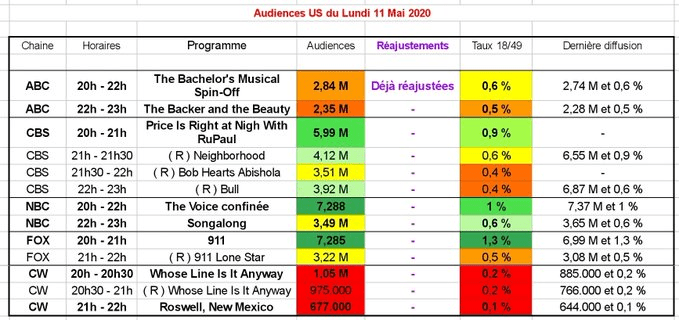 Songalong est correct sur NBC à 22h et la rediff de 911 Lone Star est à un bon niveau aussi avec plus de 3,2 M en rediff, quand on voit certaines audiences de FOX…