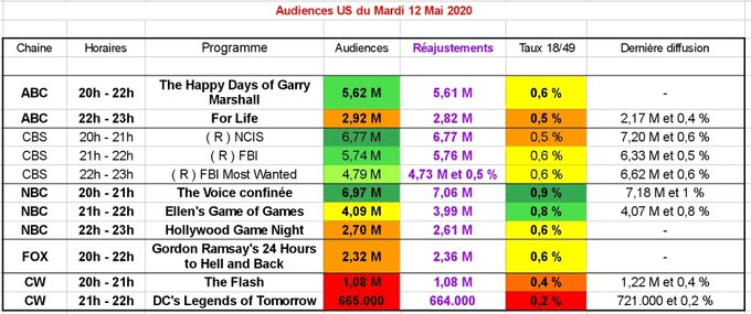 Cette semaine, c’est The Voice qui l’emporte avec son épisode consacré aux résultats de la veille attire près de 7,1 M de fidèles sur NBC et domine sur le taux, avec le meilleur taux de la soirée à 0,9 %.