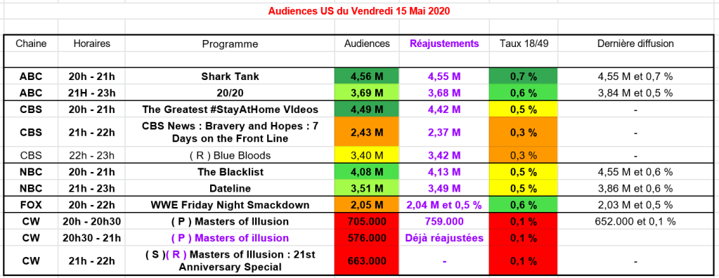 NBC diffusait le final de Blacklist avec une partie animée car le final n’avait pas fini d’être tourné, cet épisode a réuni 4,13 M et 0,5 % signant une baisse sur les deux indicateurs. NBC se classe 3e en audience, derrière ABC et CBS.