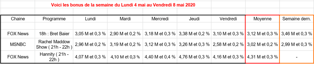 Enfin j’ai rajouté Hannity cette semaine. Le programme de FOX News est en excellente forme avec plus de 4,3 M à 21h. Une très belle performance. Un pic à 4,8 M même pour Jeudi.