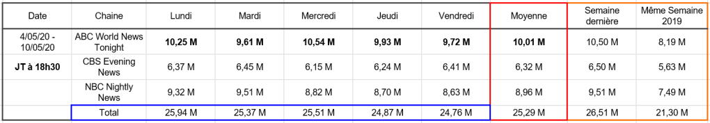 Les JT de 18h30 des trois chaines réunissent plus de 25 M de téléspectateurs ! En baisse de 1 M sur une semaine mais en hausse de 4 M sur un an !!!
