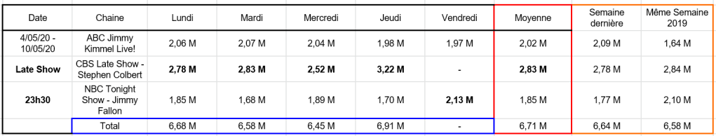En moyenne, les Late Show réunissent près de 6,7 M de téléspectateurs en hausse sur une semaine et sur un an.