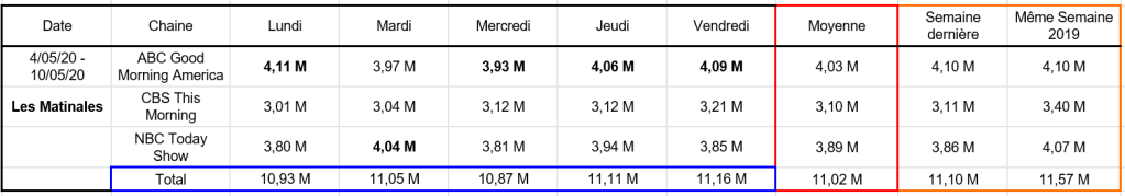 La matinale de NBC est tout proche de celle de ABC à 3,9 M en moyenne. La matinale est en légère hausse sur une semaine et en légère baisse sur un an. La matinale Savannah Guthrie et Hoda Kotb passe devant ABC mardi et classe leader à plus de 4 M.