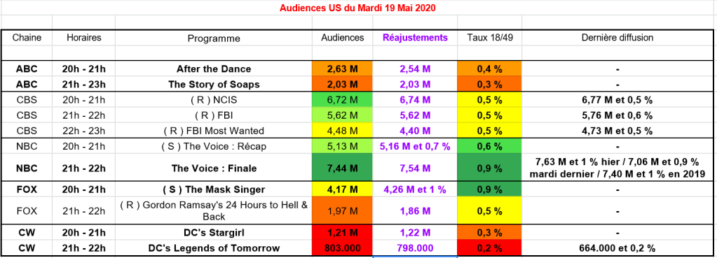 Ensuite la finale de The Voice, présentée par Carson Daly avec Kelly Clarkson, Nick Jonas, Blake Shelton et John Legend , a attirée plus de 7,5 M , dominant la soirée en téléspectateurs. Le programme est hausse sur un an sur ce critère. Sur le taux, avec 0,9 % The Voice se classe leader de 21h à 23h.