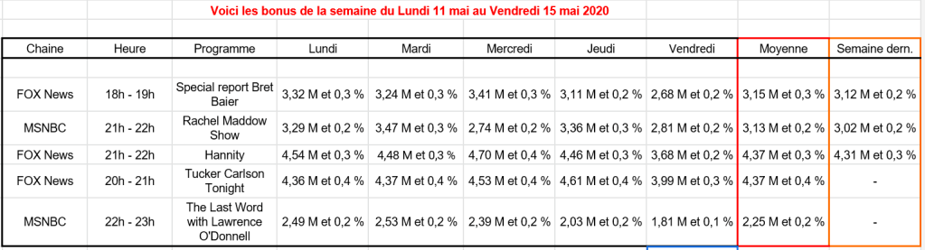 Les habituels, Bret Baier à 18h sur FOX News est en légère hausse cette semaine, après plusieurs baisses consécutive , avec 3,15 M et 0,3 %