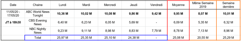 Les semaines passent et se ressemble, c’est toujours le journal de ABC qui domine facilement avec 9,95 M de téléspectateurs en moyenne. C’est légèrement moins sur une semaine, mais presque 2 M de plus sur un an. Le journal de David Muir domine les 5 soirées de la semaine.