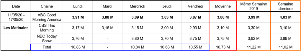 En revanche, le matin, c’est plus serré avec la concurrente NBC. En effet, Savannah Guthrie et Hoda Kotb attirent 3,75 M ; la aussi en baisse sur une semaine et sur un an, mais restent à de bons niveaux, prochent du leadership.