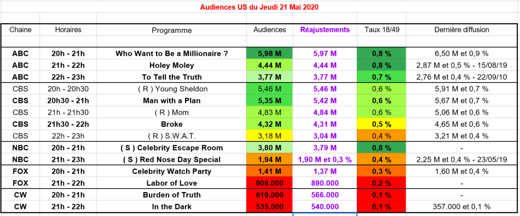 Sur ABC, un nouveau numéro de WWTBM a été diffusé et a réuni presque 6 M de fidèles et 0,8 %. Malgré une baisse de 500.000 téléspectateurs, le programme reste en forme et signe la meilleure audience de ce jeudi et le meilleur taux ( à égalité ).