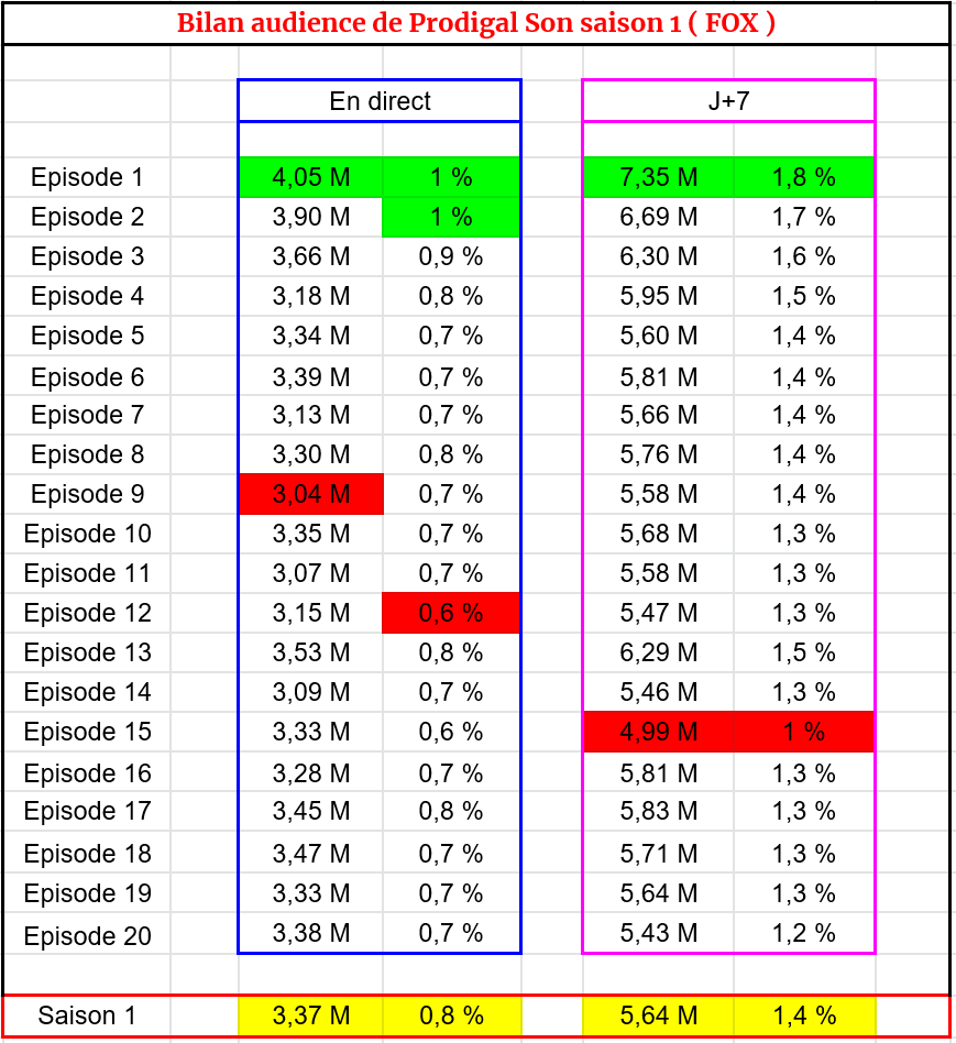 La meilleure audience est attribuée au lancement de la série avec 4,05 M net la pire audience est pour l’épisode 9 avec 3,04 M. Le meilleur taux c’est pour le lancement et l’épisode 2, le moins bon pour l’épisode 12 avec 0,6 %.