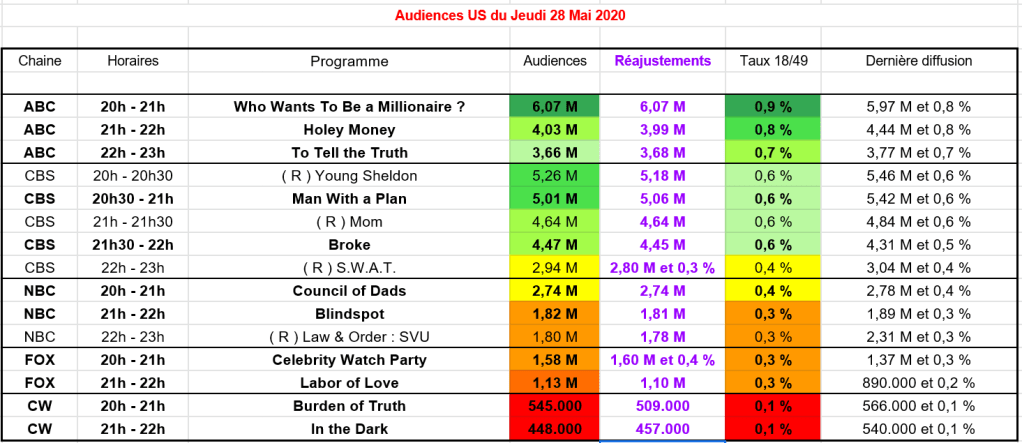 Sur CBS, les inédits de Man With a Plan ( 5,06 M et 0,6 % ; plus bas saison ) et le final de Broke ( 4,45 M et 0,6 % ) sont à de bons niveaux tout de même.