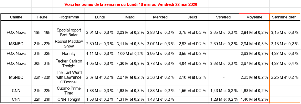Hannity à 21h sur FOX News est toujours puissant à 3,93 M et 0,3 % bien que le programme passe sous les 4 M.