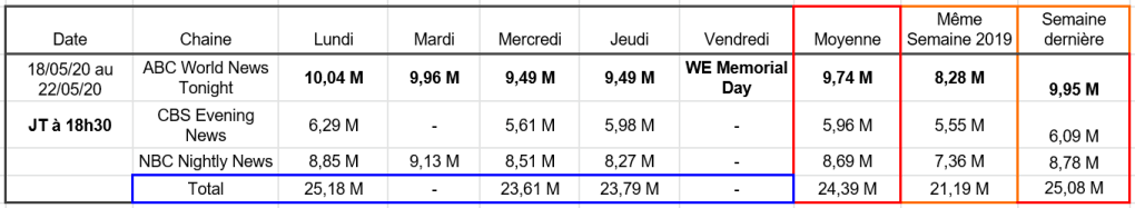 Enfin CBS avec le JT de Norah O’Donnell est à quasi 6 M de téléspectateurs en moyenne, et gagne lui 500.000 sur un an. ( Seulement 3 jours cette semaine ).