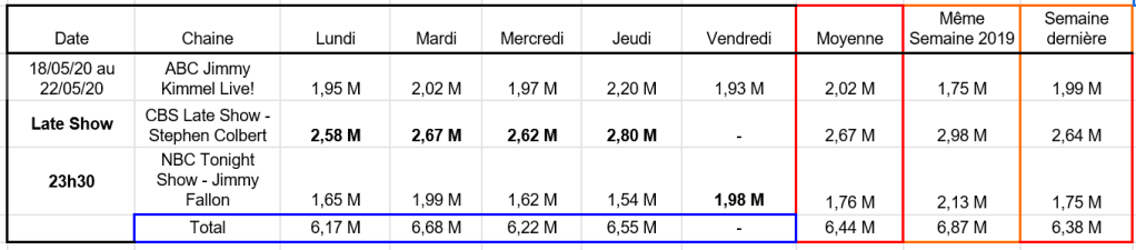 Stephen Colbert domine toujours ses 4 jours de diffusion avec en moyenne 2,67 M contre 2,64 M la semaine dernière ; en baisse sur un an ( 2,98 M )