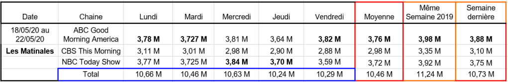 C’est donc la matinale de NBC qui suit de très proche à 3,72 M, presque stable sur une semaine. NBC se classe leader 2 fois sur 5 ( presque 3 ).
