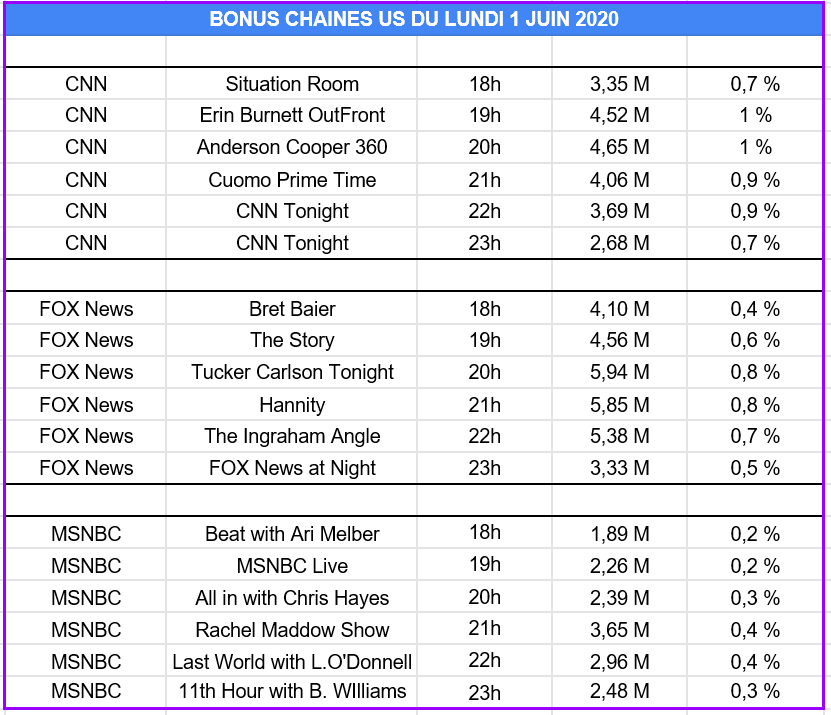 CNN est toujours très puissante sur le taux avec 1 % entre 19h et 21h. Anderson Cooper est à plus de 4,6 M à 20h !