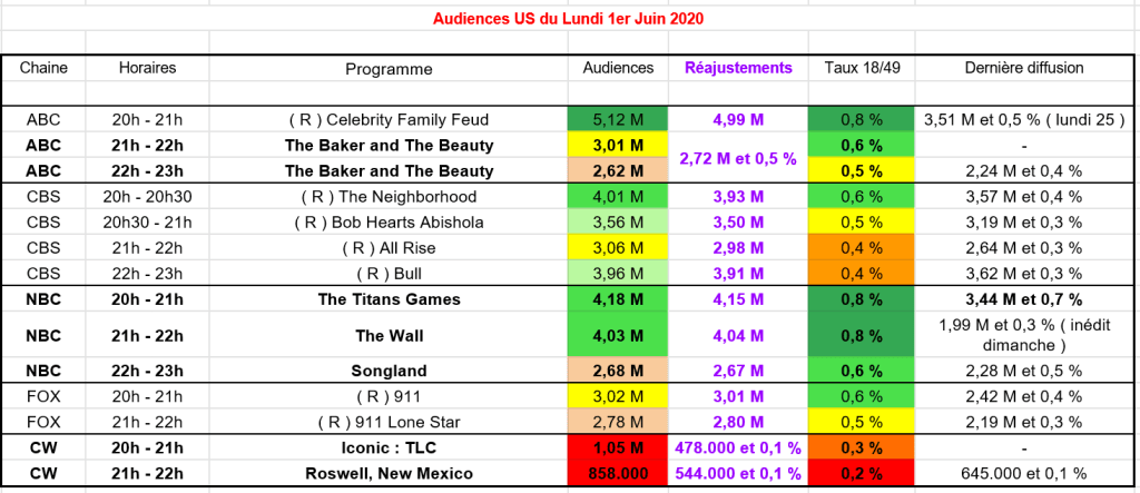 Sur CBS, les rediffusions de The Neighborhood, de Bob Hearts Abishola, de All Rise et de Bull rassemblent entre 3 M et 3,9 M et entre 0,4 % et 0,6 %. Pas si mal pour des rediffs.