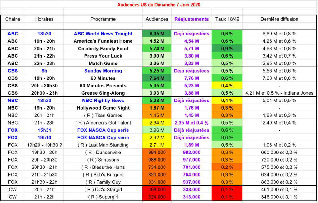 America’s Funniest Home attire 4,54 M et 0,6 % ; ensuite Celebrity Family Feud réunit 5,71 M et 0,9 % le programme signe le meilleur taux 18/49 ans de la soirée.