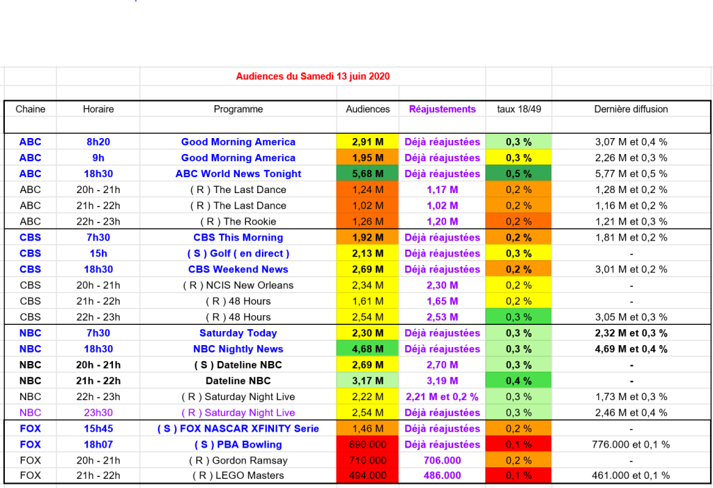 ABC est très faible avec les rediffusions de The Last Dance et de The Rookie qui attirent entre 1 M et 1,3 M !! et 0,2 % sur le taux.
