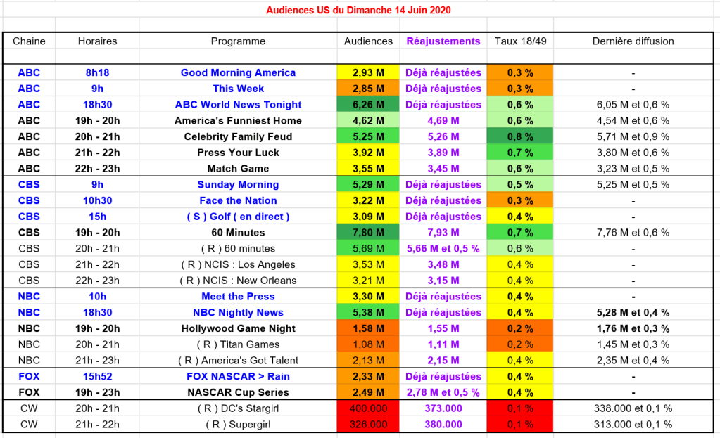 En ce dimanche 14 Juin ; les soirées de ABC et CBS sont performantes.