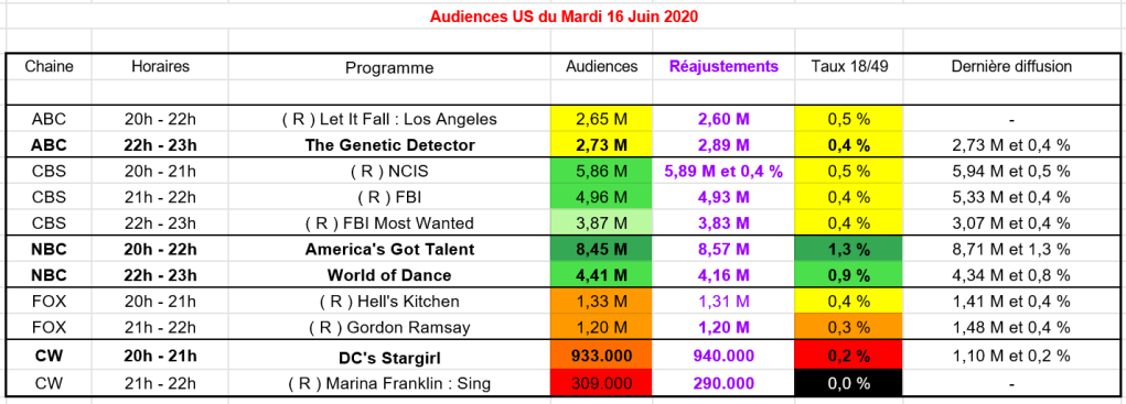 Mais c’est bien évidemment NBC avec AGT qui domine très largement et est puissant. Le divertissement de NBC rassemble 8,57 M et 1,3 % sur le taux. En baisse mais excellente performance.