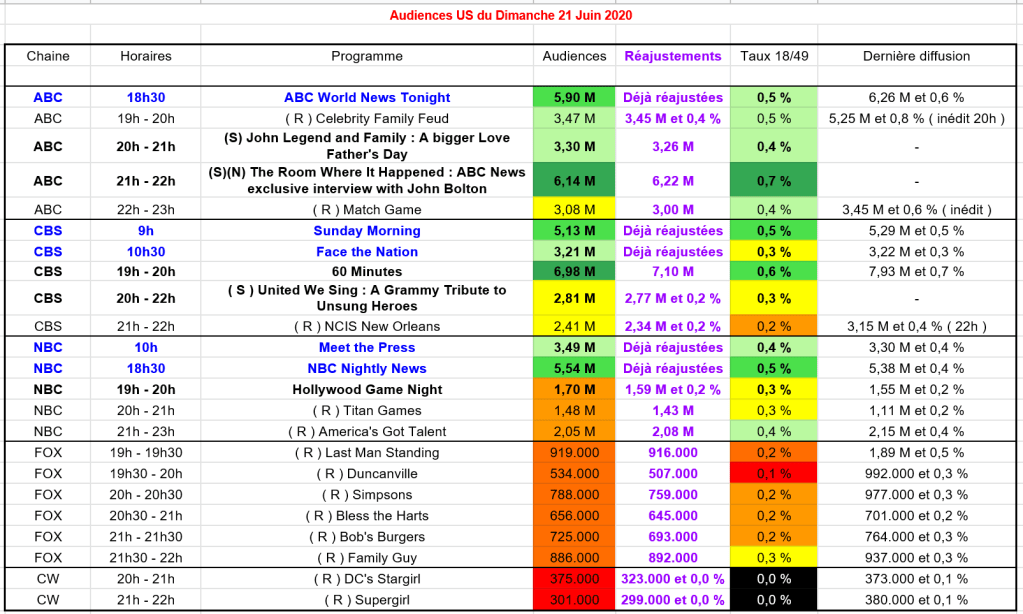 La spéciale de ABC News avec l’interview exclusive de John Bolton réalise un très gros score avec 6,22 M et 0,7 %. Le programme est très large leader ! Excellent score.
