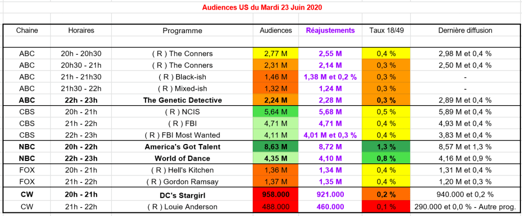 Seul NBC est en inédit toute sa soirée, avec AGT qui signe la meilleure audience et le meilleur taux de la soirée avec 8,72 M et 1,3 %. Très large leader et en hausse.