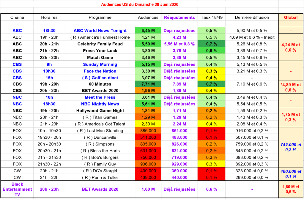 Ensuite entre 20h et 23h, CBS diffusait les BET Awards 2020 ; suivi par seulement 1,89 M et 0,4 %. L’édition 2019 était sur Black Entertainment TV et avait rassemblé 2,43 M et 1 % sur le taux.