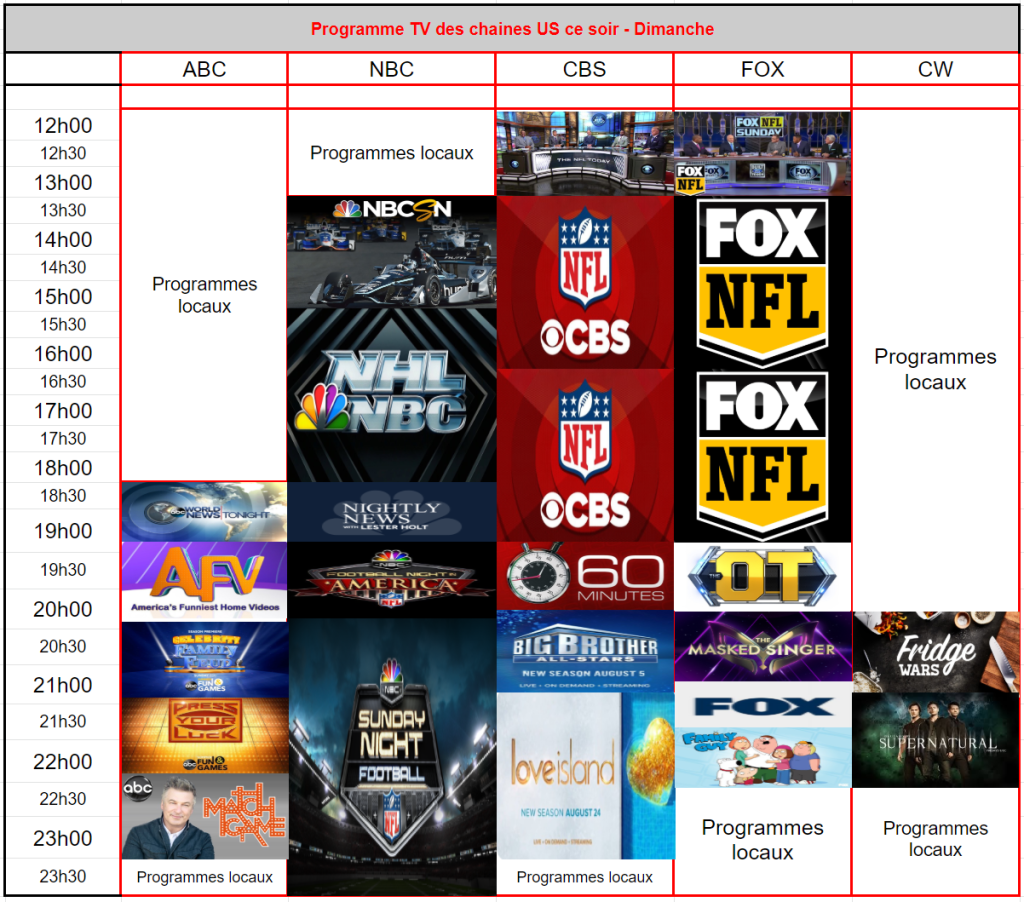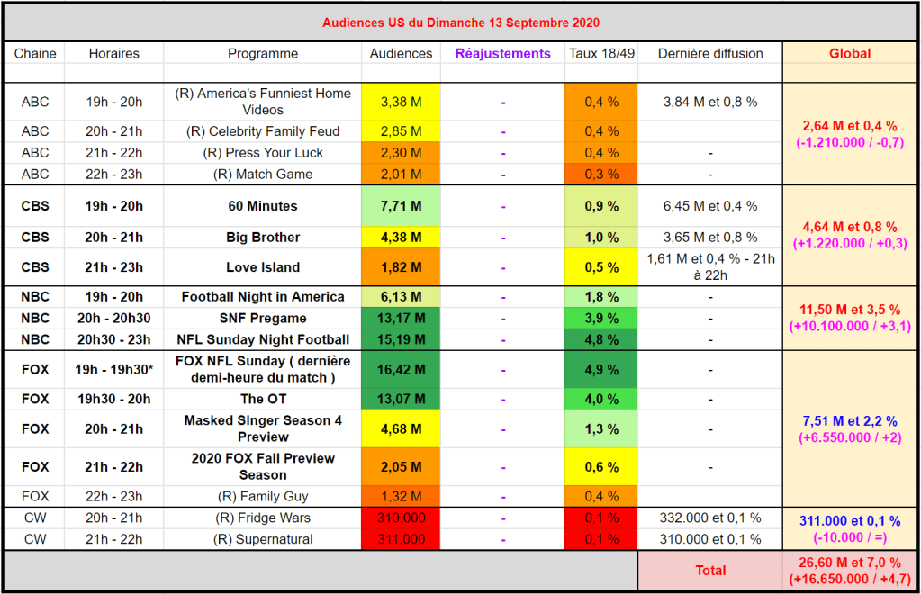 ATTENTION : Les réajustements peuvent être importants pour le sport. De plus, le score du match NFL de FOX est que sur 19h / 19h30 ( L’audience du match entier sera communiqué avec les réajustements.