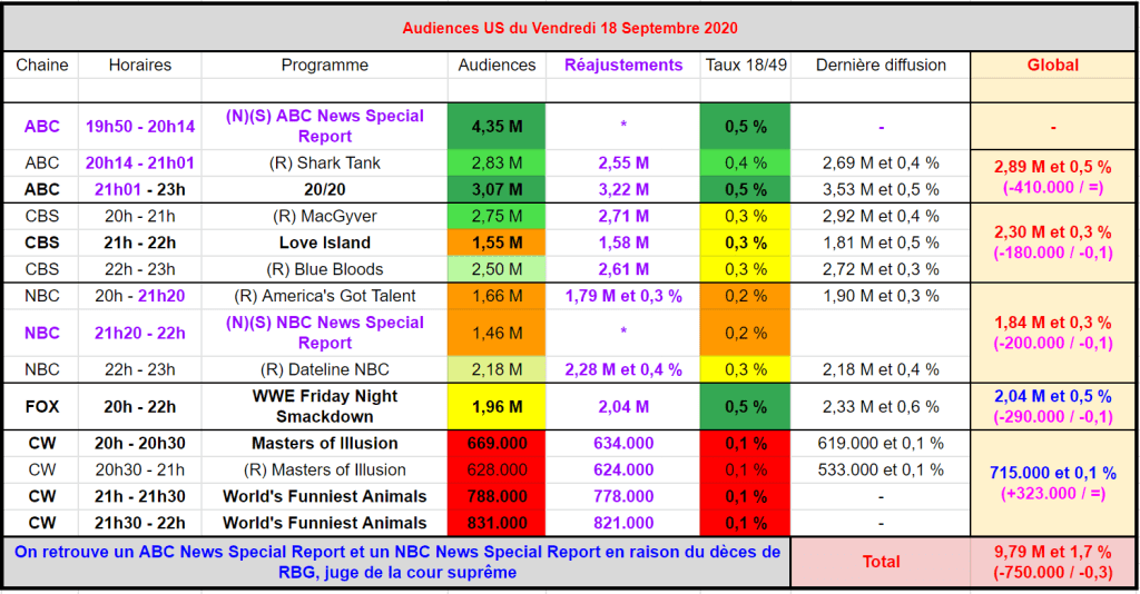 Un ABC News Special Report est à 4,35 M et 0,5 % à 19h50 – Le NBC News Special Report de 21h20 est à 1,46 M et 0,2 %