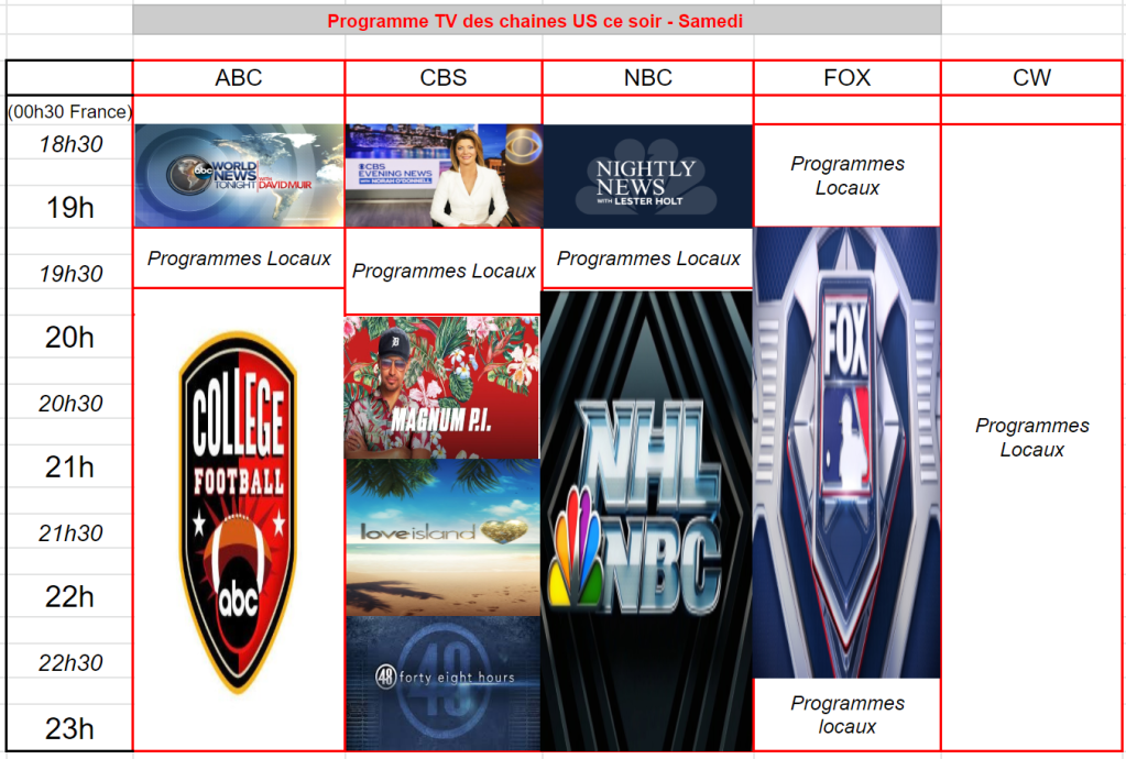 Comme tous les samedis, peu de programme, beaucoup de sport sur les chaines US et un total tv quasi stable.
