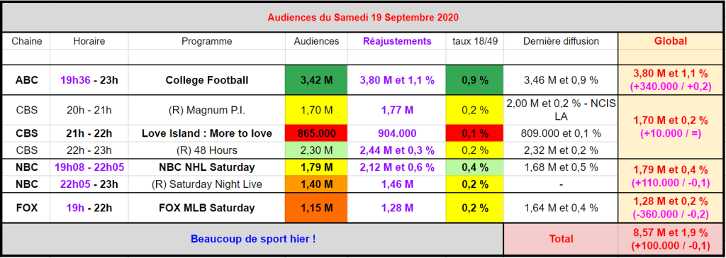Et la aussi, comme samedi dernier, College Football domine facilement les rencontres sur ABC avec 3,80 M et 1,1 % – Meilleure audience et meilleur taux de la soirée ! – Très bon niveau.
