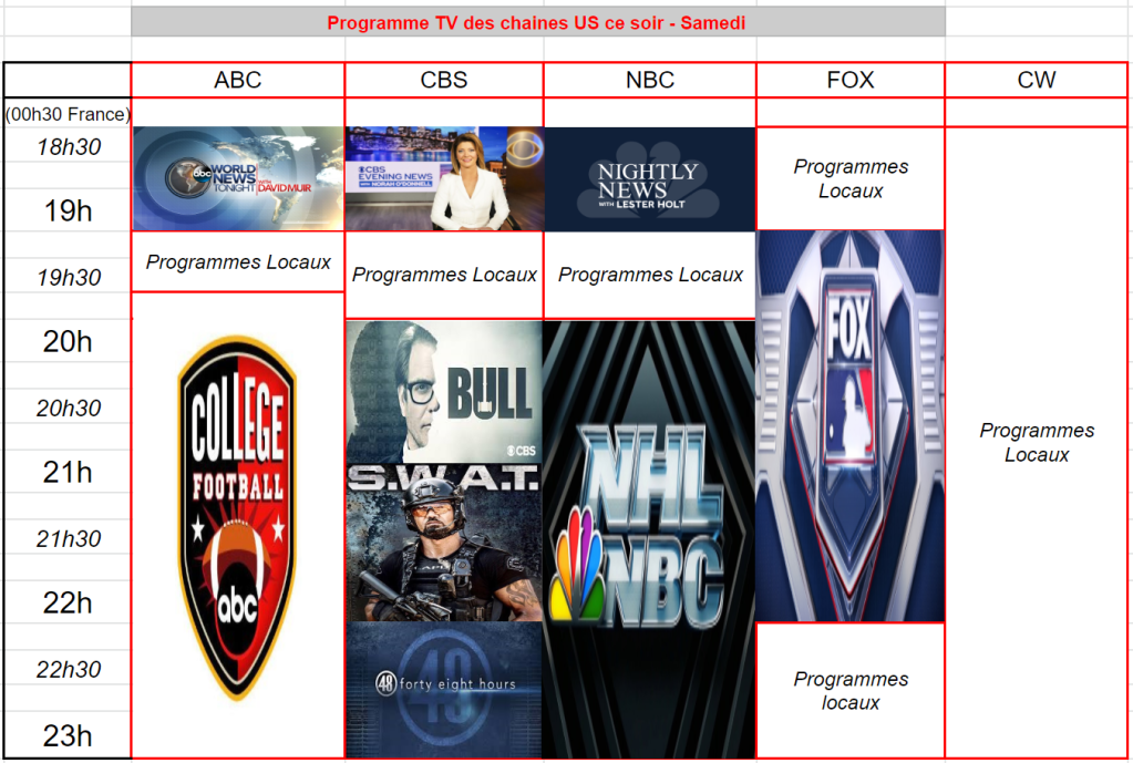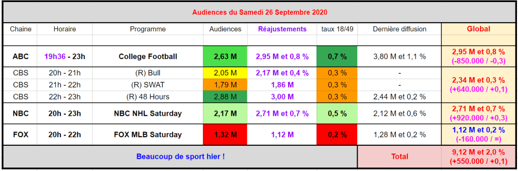 Du coté de ABC, College Football est en baisse à 2,95 M et 0,8 % en moyenne – Si on prend heure par heure, AVANT REAJUSTEMENTS, c’est College football qui signe la meilleure audience de la soirée ( 3,24 M / 2,57 M / 2,08 M et 0,8 % / 0,7 % / 0,6 % sur les 3 heures ) – Meilleur taux de la soirée