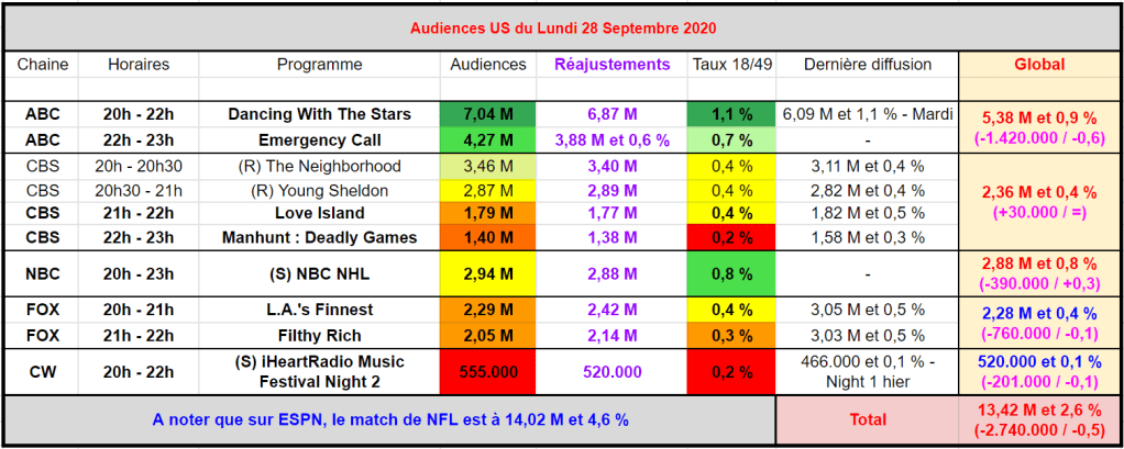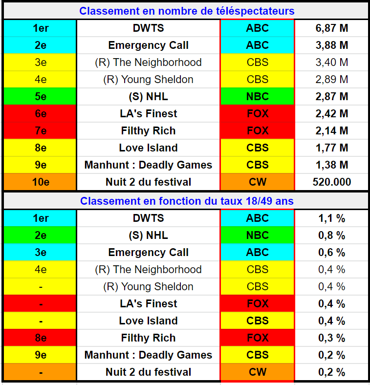 Ensuite Emergency Call rassemble 3,88 M et 0,7 % – La deuxième meilleure audience de la soirée – Soit une très bonne soirée pour ABC très largement leader. – Réajustements du à la NFL pour DWTS et Emergency Call