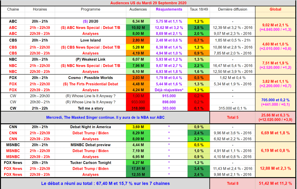 Ensuite, suit NBC avec 9,67 M et 2,7 % pour le débat puis 6,93 M et 1,8 % pour l’analyse en plateau