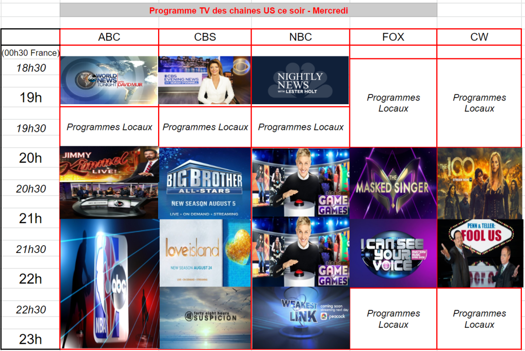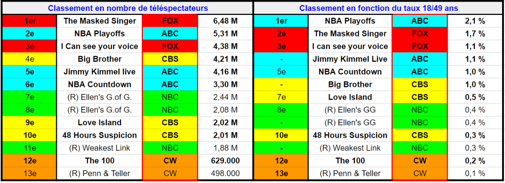 Mardi, on voyait très bien la domination NBC/ABC – Hier on remarque une domination FOX/ABC