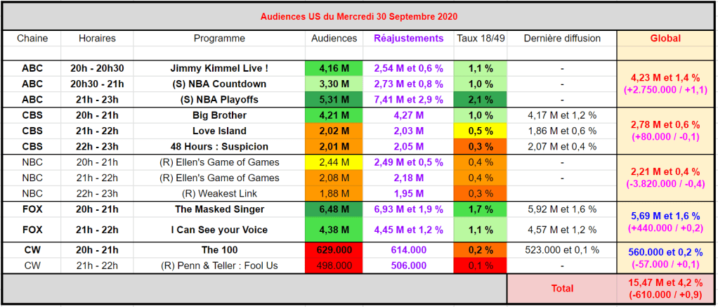 Sur CBS Big Brother signe son record de saison en téléspectateurs à 4,27 M et 1,0 % – Ensuite, Love Island est en forme pour son final – par rapport au reste de la saison – à 2,03 M et 0,5 % – en baisse sur une saison par contre. – 48 Hours : Suspicion est en légère baisse à 2,05 M et 0,3 % ; pas au top !