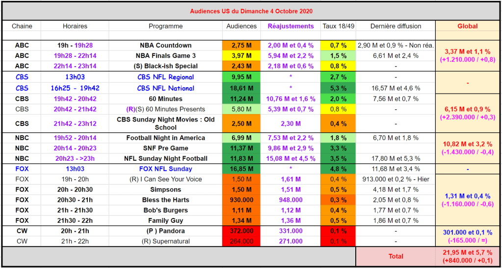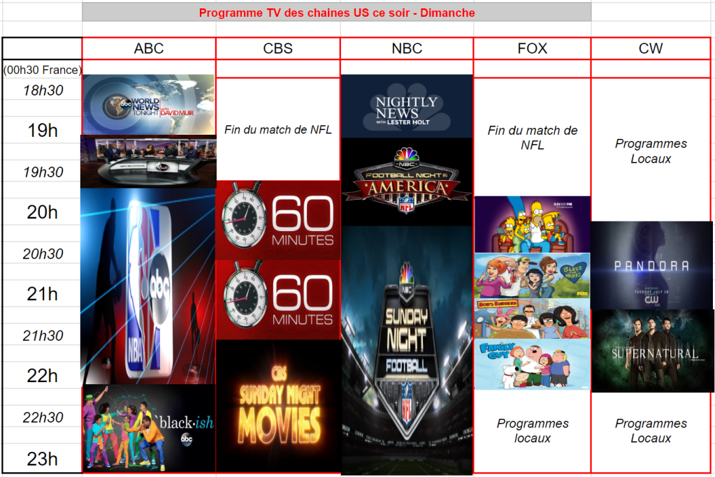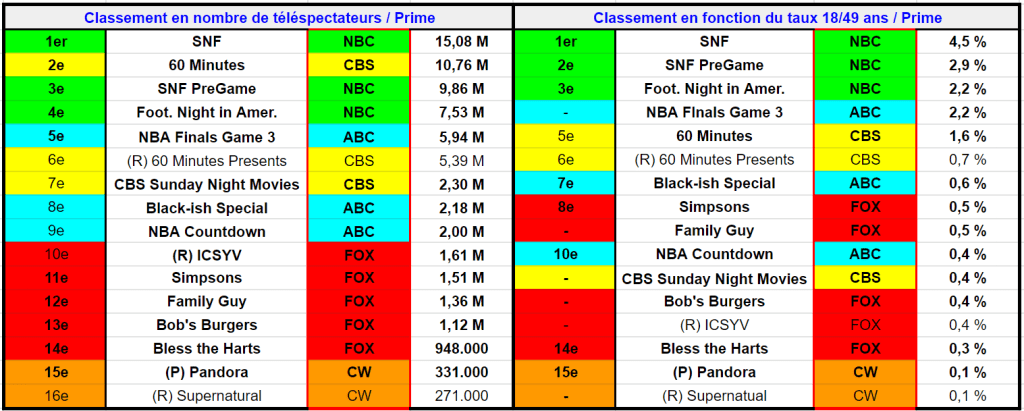 Les match de NFL, que ce soit sur NBC, CBS ou FOX sont toujours de gros cartons ! Avec 15,08 M sur NBC en prime et dans l’après midi, 18,61 M su CBS et 16,85 M sur FOX