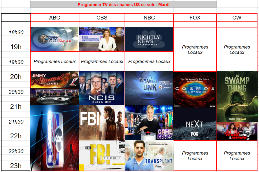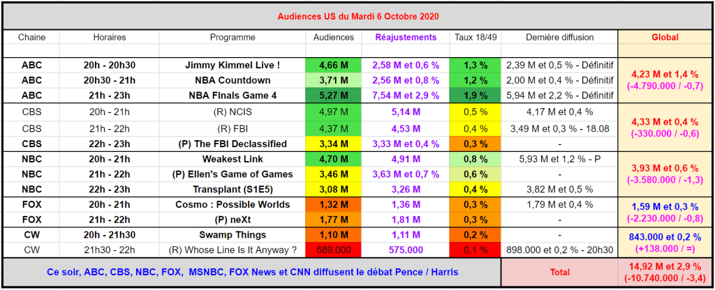 Je le rappelle, mais vous avez l’habitude (j’espère), Jimmy Kimmel Live! et NBA Countdown vont être réajustés en baisse et le match de NBA va être réajusté en hausse.