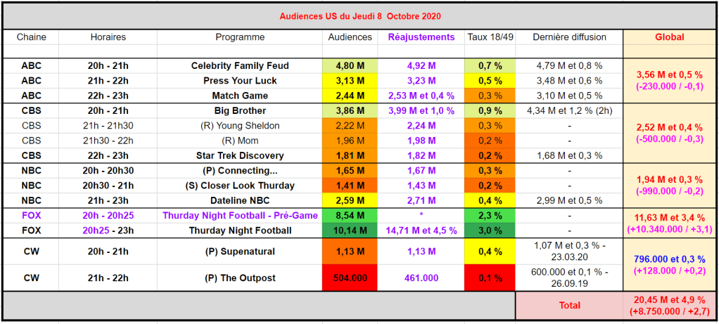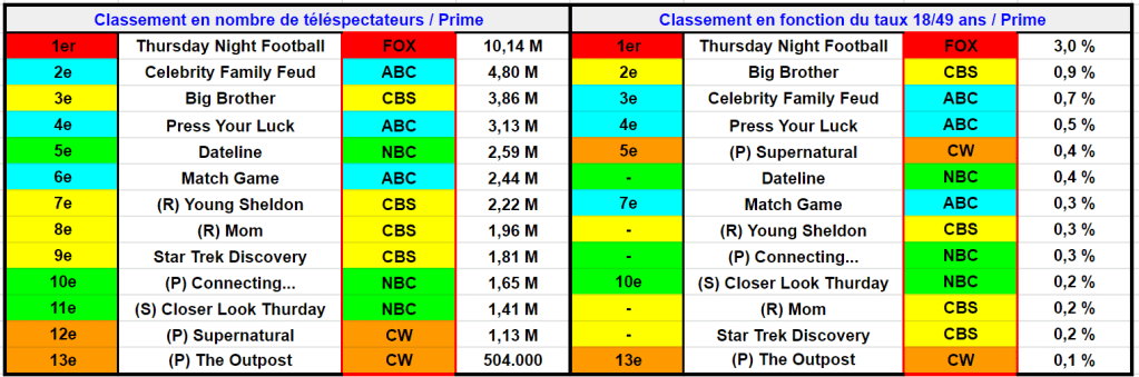 Big Brother attire 3,99 M et 1,0 % (en baisse) – Press your Luck rassemble 3,23 M et 0,5 % (en baisse), Match Game est à 2,53 M et 0,4 % (en baisse) – Young Sheldon captive 2,24 M et 0,3 % (pas top), Mom rassemble 1,98 M et 0,2 % (faible) – Dateline est à 2,71 M et 0,4 % (en baisse).