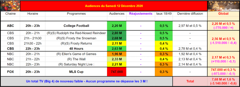 Frosty the Snowman rassemble 2,68 M et 0,5 % – La aussi bon en audience, leader et meilleur taux en trio. Frosty Returns a été regardé par 2,11 M et 0,4 %