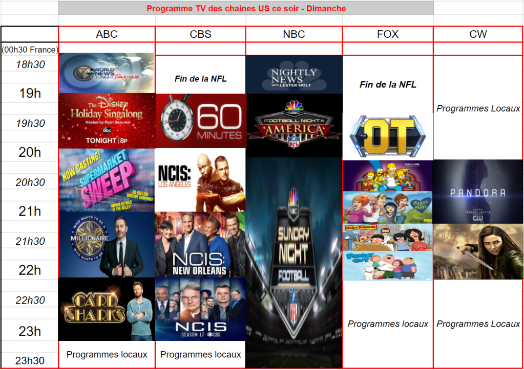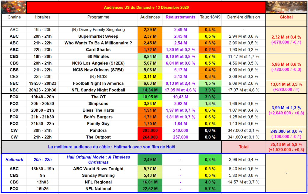 Sur CBS, sans la NFL nationale avant, 60 Minutes baisse mais reste très bon. NCIS LA et NCIS NO qui sont dans les bonnes cases pour une fois, et on remarque donc que les deux séries sont en hausse. LA passe même les 6 M.