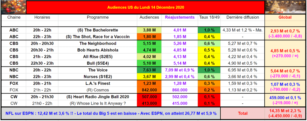 A noter la très forte concurrence de ESPN avec la NFL avec 12,42 M et 3,6 %