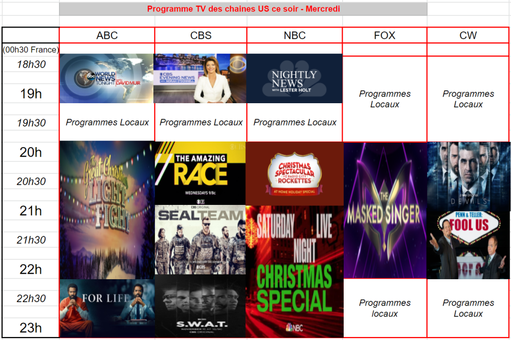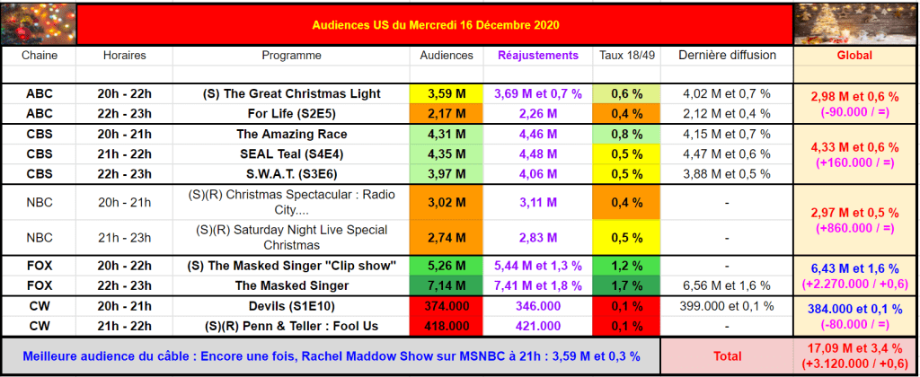 On commence par ABC, avec The Great Christmas Light Fight (il manque un bout dans le tableau) qui attire 3,69 M et 0,7 % – Stable sur taux mais en baisse téléspectateurs.