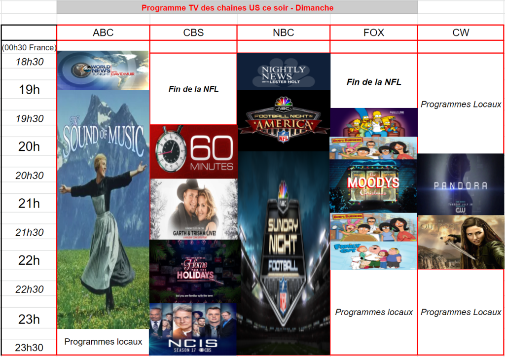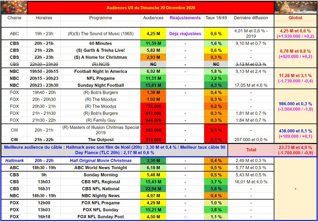 Toujours de gros score avec la NFL sur CBS et FOX avec 15,43 M ; 22,94 M ; 15,21 M ; 15,61 M le soir sur NBC.