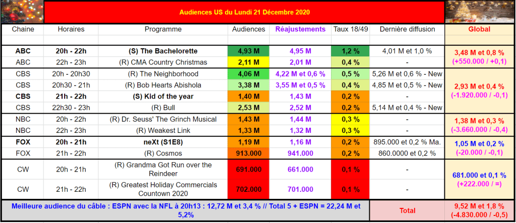 The Bachelorette domine facilement sans grande concurrence et attire 4,95 M et 1,2 % – Très très bon score. La relance de CMA Country Christmas rassemble 2,01 M et à,4 %