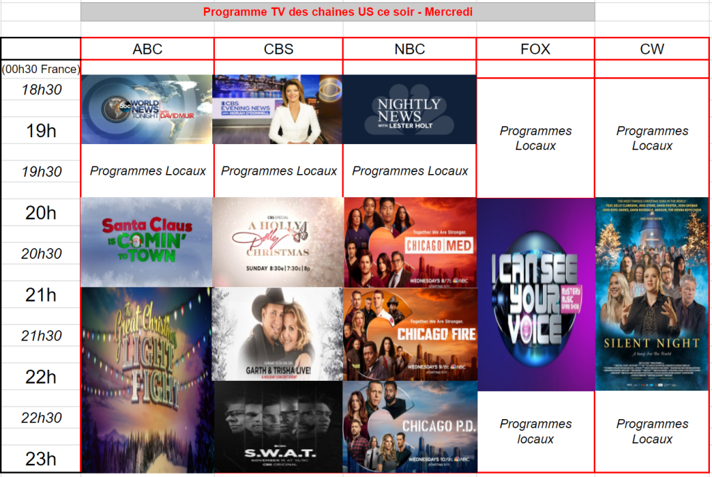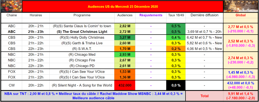 ABC est à un bon niveau sur le taux avec une relance de Santa Claus…. à 2,82 M et 0,5 % et le seul programme inédit de la soirée, The Great Christmas Light Fight avec 2,72 M et 0,5 % – Les deux programmes sont leader sur cible.