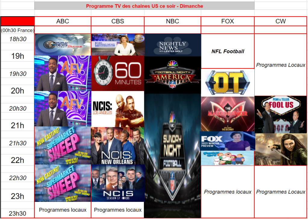 Forcément, le dimanche, c’est LA soirée de NBC. Avec la NFL, sport le plus suivi aux Etats-Unis, NBC est très puissante le dimanche soir encore plus ce dimanche.